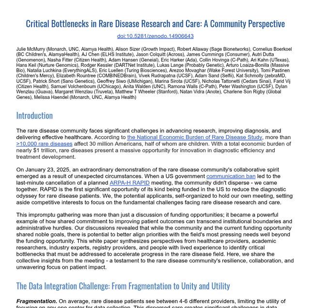 This document details an impromptu community gathering following the cancelation of an ARPA-H proposer's day for the Rare Disease AI/ML for Precision Integrated Diagnostics (RAPID) program. The discussion became a powerful example of how shared commitment to improving patient outcomes can transcend institutional boundaries and administrative hurdles. This white paper synthesizes perspectives from healthcare providers, academic researchers, industry experts, registry providers, and people with lived experience to identify critical bottlenecks that must be addressed to accelerate progress in the rare disease field. [...]